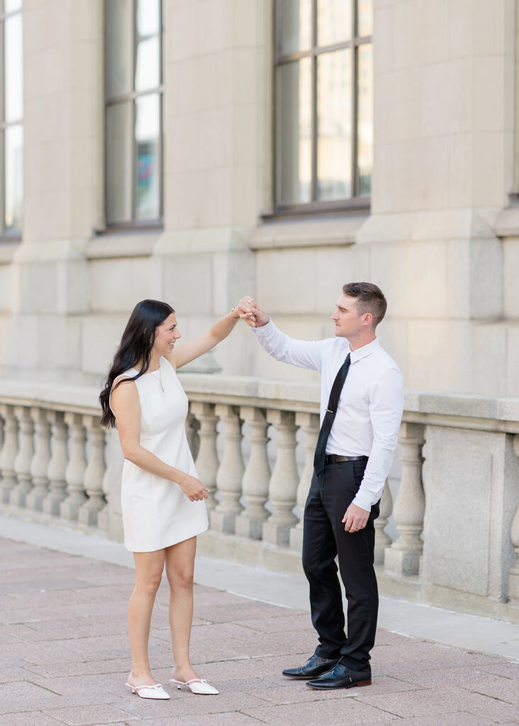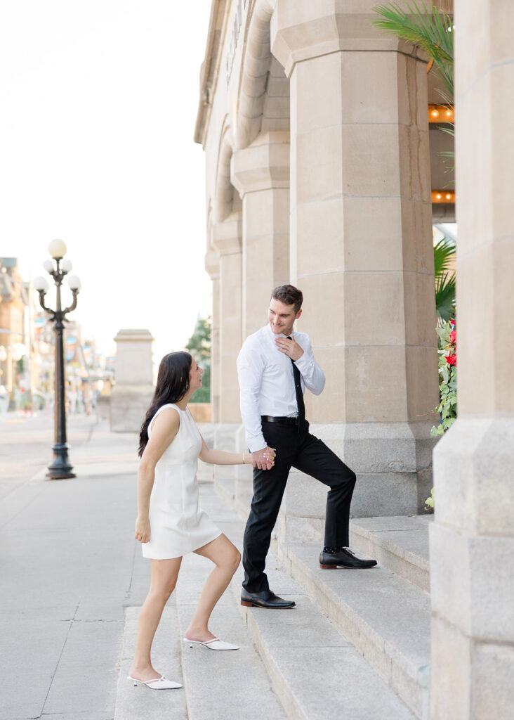 There’s something undeniably magical about photographing an engagement session around the exterior of the Fairmont Château Laurier. Its grand archways, soft stone tones, and European-inspired architecture create such a timeless backdrop, and for Laura and Derek, it was the perfect place to celebrate this exciting season of their lives.